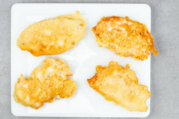 200ml kaltes Wasser mit 2TL Backpulver und 160g Mehl verrühren und den Teig mit je 1 kräftigen Prise Salz und Pfeffer würzen. Tipp: Wer den Messbecher sparen möchte, kann auch 200g Wasser abwiegen. Für das Dressing die Crème fraîche mit der Zitronenschale, dem Zitronensaft, 2EL Mayonnaise und 2EL Senf verrühren.