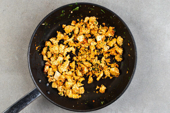 Den Tofu, den Knoblauch und die ½ des Korianders in einer zweiten großen Pfanne mit 2EL Olivenöl, der Gewürzmischung sowie je 1 kräftigen Prise Salz und Zucker bei mittlerer Hitze ca. 4Min. anbraten.