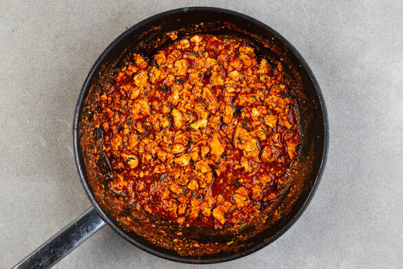 Das Tomatenmark zum Tofu geben und ca. 1Min. mitbraten, dann 150ml Wasser angießen und 2–3Min. einköcheln, bis sich eine dickflüssige Sauce bildet. Mit Salz und Zucker abschmecken. Die Tofusauce, die Paprika und die Salsa auf den Süßkartoffelpommes verteilen. Mit dem übrigen Koriander und der Limettenschale garnieren und mit den Limettenspalten servieren.