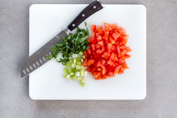 Währenddessen die Tomaten vierteln und in kleine Würfel schneiden. Die Lauchzwiebel putzen und in feine Ringe schneiden. Die Basilikumblätter von den Stängeln zupfen und in feine Streifen schneiden.