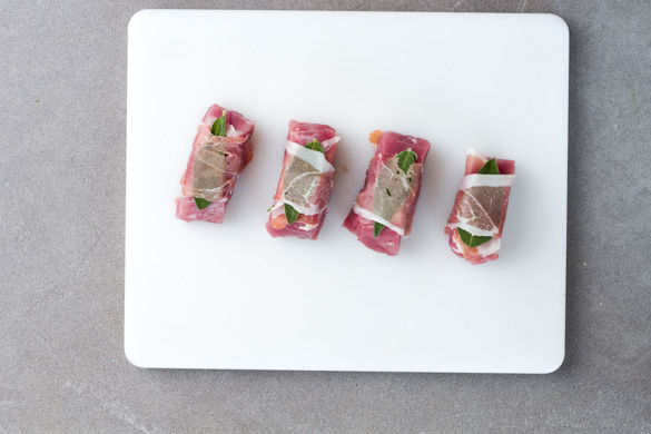 Den Schinkenscheiben längs halbieren und mit je 1 Salbeiblatt um ein Stück Schweinefilet wickeln. Den restlichen Schinken für andere Zwecke verwenden.