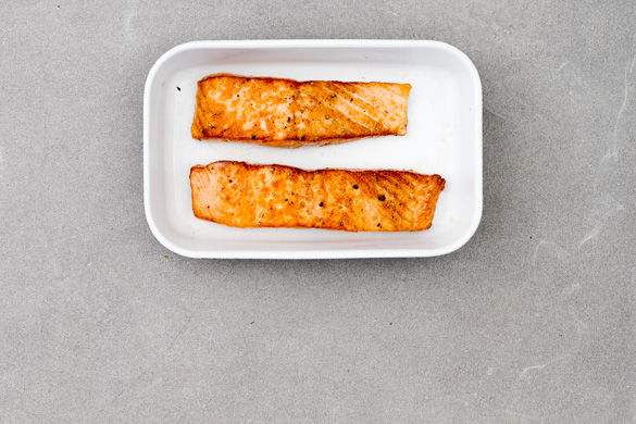 Den Lachs von beiden Seiten mit Salz und Pfeffer würzen und in einer großen Pfanne mit 1-2EL Olivenöl bei mittlerer Hitze von jeder Seite ca. 1-2Min. anbraten. Dann in eine Auflaufform geben und ca. 6-8Min. im Ofen fertig garen. Tipp: Die Garzeit kann je nach Dicke des Fisches variieren. Die Pfanne z. B. mit Küchenpapier auswischen.