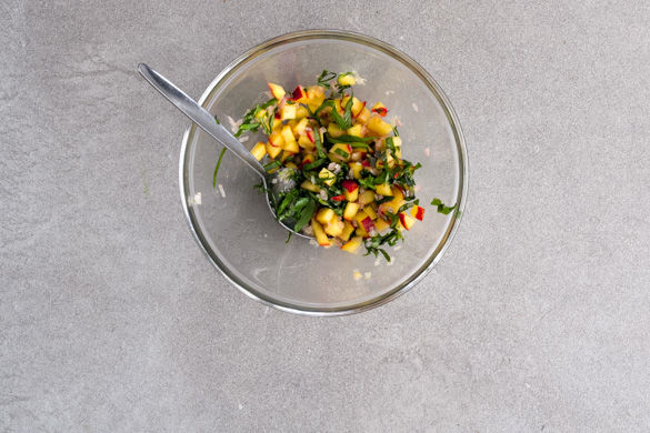 In einem kleinen Topf die Schalottenwürfel mit 1-2EL Olivenöl ca. 1-2Min. anschwitzen, dann die Pfirsichwürfel und je nach Reifegrad/Süße der Pfirsiche 1-2Prisen Zucker dazugeben. Den Topf vom Herd nehmen.