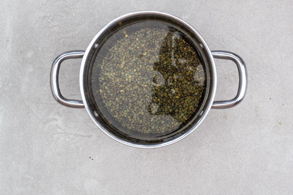 Den Backofen auf 200°C Umluft oder 220°C Ober-/Unterhitze vorheizen. Einen mittelgroßen Topf mit 1,5L Wasser zum Kochen bringen. Sobald das Wasser kocht, die Linsen darin zugedeckt ca. 20-25Min. kochen. Dann abgießen und kalt abschrecken.
