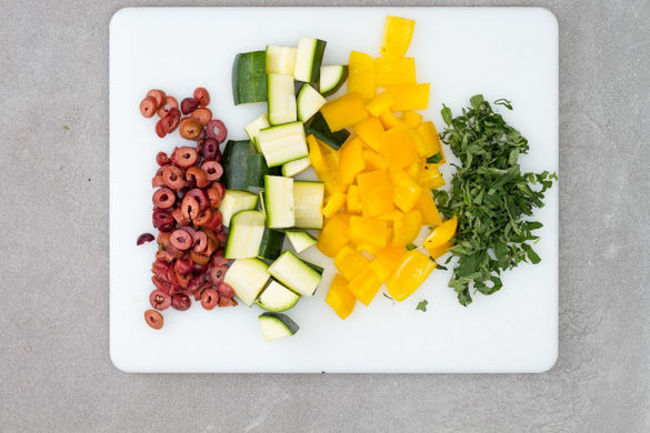 Währenddessen die Paprika vierteln, entkernen und in ca. 1-2cm große Würfel schneiden. Die Zucchini putzen, längs vierteln und in ca. 2-3cm breite Scheiben schneiden. Die Oliven in Ringe schneiden. Die Oreganoblätter von den Stängeln streifen und fein hacken.
