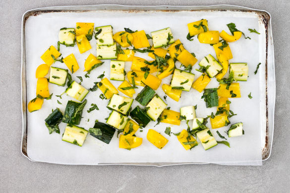 Den Oregano mit Paprika, Zucchini und Oliven sowie 1EL Olivenöl mischen und mit Salz und Pfeffer würzen. Auf einem mit Backpapier ausgelegten Backblech verteilen und im Ofen ca. 20-25Min. goldbraun backen.