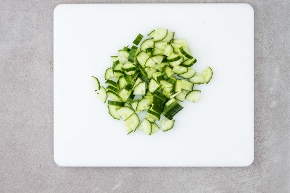 Die Pinienkerne die letzten ca. 3-5Min. über dem Ofengemüse verteilen und mitrösten. Inzwischen die Gurke putzen, längs vierteln und in ca. 5mm dünne Scheiben schneiden.