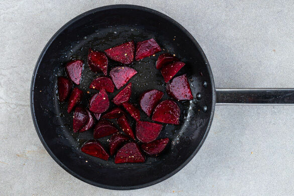 Die ½ der Roten Bete in Spalten schneiden und in einer mittelgroßen Pfanne mit 1TL Olivenöl bei mittlerer Hitze 4–5Min. erwärmen. Mit Salz und Pfeffer würzen. Tipp: Wer mag, kann auch mehr Rote Bete verwenden.