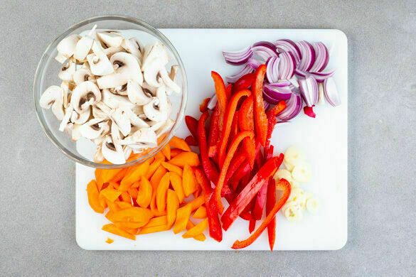 Die Paprika vierteln, entkernen und in dünne Streifen schneiden. Die Karotten ggf. schälen, längs halbieren und schräg in dünne Scheiben schneiden. Die Pilze ggf. säubern, je nach Größe vierteln oder sechsteln. Die Zwiebeln schälen, halbieren und in dünne Spalten schneiden. Den Knoblauch schälen und in feine Scheibchen schneiden.