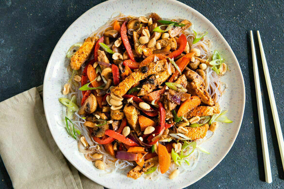 Gutes Essen kann so einfach sein: Wir schnippeln uns eine vernünftige Portion Pilze und frisches Gemüse, braten saftige Schweinefleischstreifen schmackhaft an, würzen mit Soja- und Bohnensauce und servieren diese Köstlichkeit dann auf leichten Glasnudeln. Obendrauf noch ein paar knackige Erdnüsse, und schon ist alles fertig. Einfach, lecker, schnell – besser geht’s nicht!