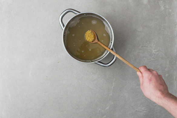 In einem mittelgroßen Topf 600ml Wasser zum Kochen bringen. Den Bulgur mit dem Brühgewürz in das kochende Wasser geben und abgedeckt bei niedriger Hitze 5–7Min. sanft köcheln lassen, bis das Wasser aufgesaugt und der Bulgur gar ist. Noch ca. 5Min. ohne Hitzezufuhr ziehen lassen.