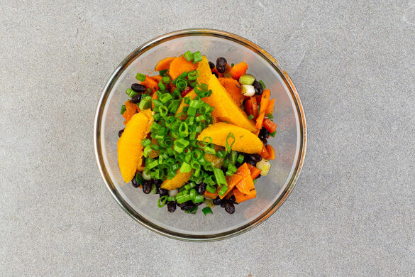 Die Orange mit einem Messer so schälen, dass auch die weiße Haut entfernt wird. Das Fruchtfleisch in kleine Stücke schneiden und mit den Lauchzwiebeln und 1EL Essig unter das Bohnengemüse mengen. Den Salat mit Salz und Pfeffer abschmecken.