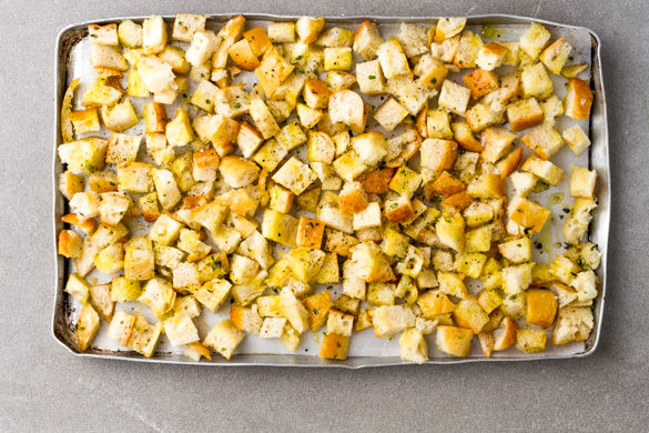 Die Brotwürfel mit dem Thymianöl und etwas Salz mischen, auf einem mit Backpapier ausgelegten Backblech verteilen und im Ofen ca. 10-12Min. goldbraun rösten.
