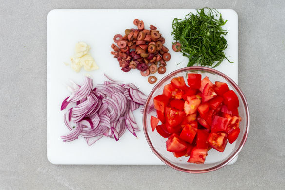 Währenddessen die Tomaten in ca. 1-2cm große Stücke schneiden. Die Zwiebel schälen, halbieren und in feine Streifen schneiden. Den Knoblauch schälen und fein hacken. Die Oliven in Ringe schneiden. Die Basilikumblätter von den Stängeln zupfen und in feine Streifen schneiden.