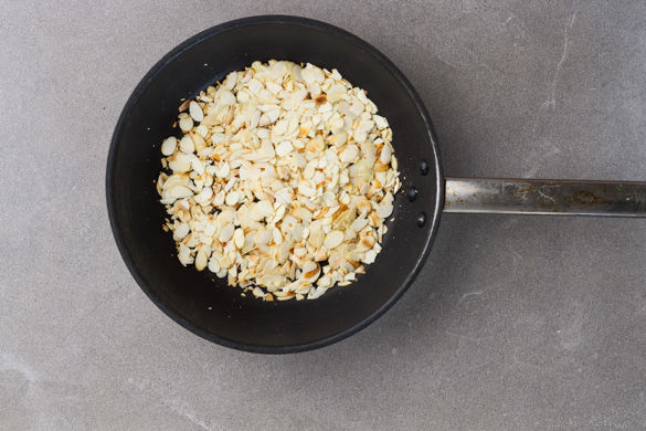 Die Mandeln in einer kleinen Pfanne ohne Öl auf niedriger Hitze ca. 1-2Min. goldgelb anrösten. Vorsicht! Die Mandeln können schnell anbrennen. Zum Abkühlen aus der Pfanne nehmen, sie dunkeln sonst noch nach.
