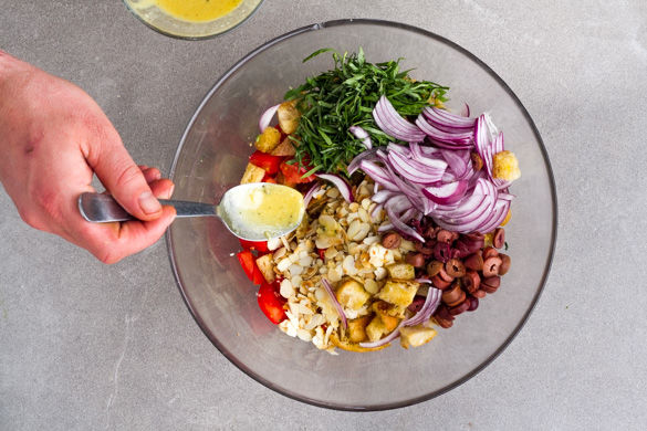 Den Knoblauch mit dem Senf, 1-2EL Olivenöl, 1-2EL Essig, Salz und Pfeffer zu einem Dressing mischen. Das geröstete Brot mit den Tomaten, den Zwiebeln, den Oliven, dem Basilikum, den Mandeln und dem Dressing mischen, erneut mit Salz und Pfeffer abschmecken und den Salat ca. 5Min. ziehen lassen.