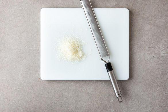 Den Backofen auf 200°C Umluft oder 220°C Ober-/Unterhitze vorheizen. Die Zwiebel und den Knoblauch schälen, halbieren und in feine Würfel schneiden. Die Rosmarinblätter von den Stängeln zupfen und fein hacken. 600ml Wasser in einem Wasserkocher aufkochen und den Brühwürfel in dem heißen Wasser auflösen.