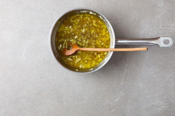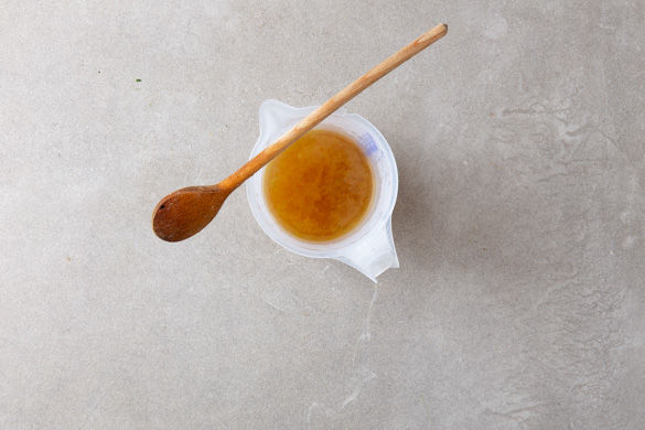 In einem Wasserkocher 400ml Wasser aufkochen und den Brühwürfel und die Gewürzmischung im heißen Wasser auflösen.