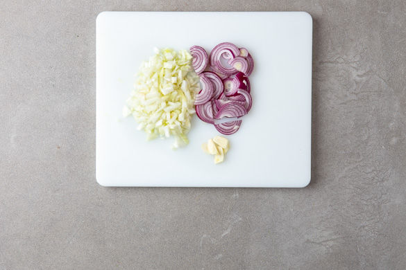 Die weiße Zwiebel schälen, halbieren und in feine Würfel schneiden. Die rote Zwiebel schälen, halbieren und in feine Streifen schneiden. Den Knoblauch schälen und in feine Scheibchen schneiden.