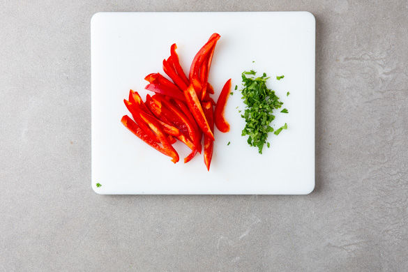Währenddessen die Paprika entkernen und vierteln, dann in ca. 1-2cm breite Streifen schneiden. Den Koriander samt Stängeln grob hacken; wer mag, kann ein paar Blätter für die Garnitur aufheben.