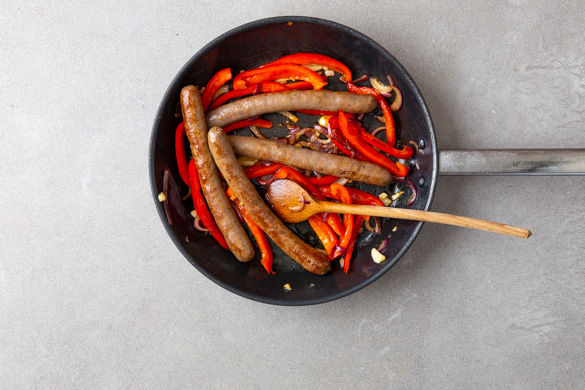 Die Merguez in einer mittelgroßen Pfanne in 1-2EL Olivenöl ca. 2-3Min. scharf anbraten, dann die Paprika- und Zwiebelstreifen sowie den Knoblauch hinzugeben und bei mittlerer Hitze ca. 2-3Min. mitbraten, bis alles bissfest angebraten ist. Vorsicht, der Knoblauch kann leicht verbrennen.