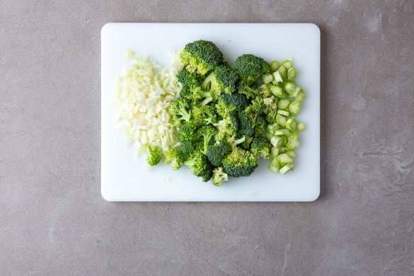 Die Zwiebel schälen, halbieren und fein hacken. Vom Brokkoli mundgerechte, ca. 2cm große Röschen abteilen. Den Brokkolistrunk schälen und in ca. 1cm große Würfel schneiden. Von der Zitrone ca. 1–2TL Schale abreiben. Eine Hälfte auspressen, die zweite Hälfte in Spalten schneiden.