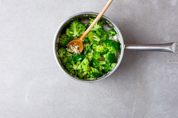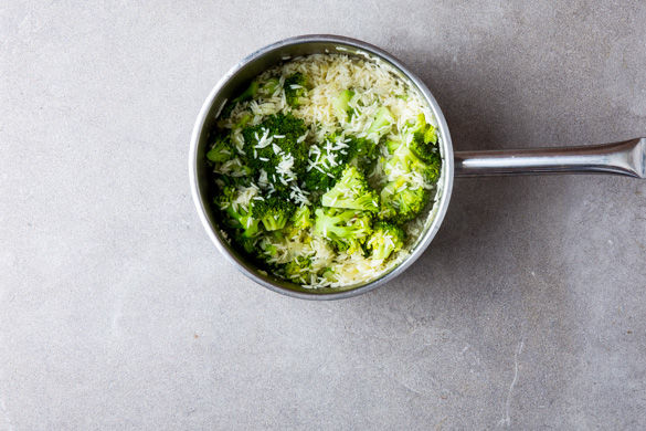 Den Reis mit 1–2TL Zitronenschale und dem Zitronensaft zu dem Brokkoli geben, mit der Brühe übergießen und alles abgedeckt auf mittlerer Hitze ca. 6–7Min. köcheln lassen. Der Reis soll noch nicht ganz durchgaren.