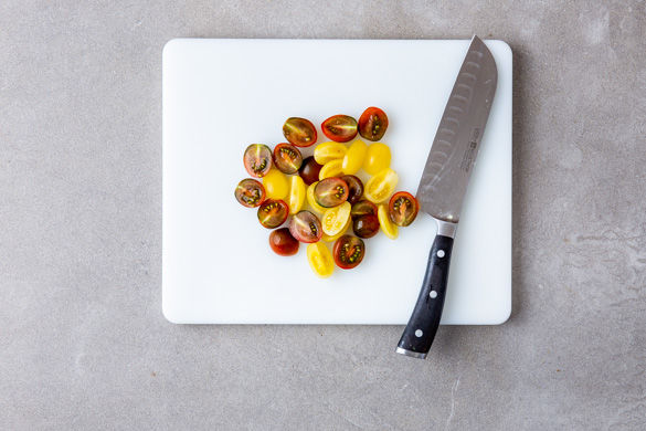 Inzwischen die Tomaten halbieren. Den Käse mit einer Gabel oder den Händen grob zerkrümeln.