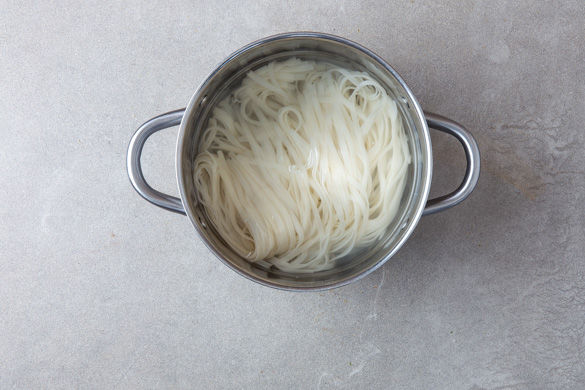 In einem Wasserkocher 1,5L Wasser für die Nudeln zum Kochen bringen. Etwa 2/3 der Reisbandnudeln in einem mittelgroßen Topf mit dem kochenden Wasser übergießen und ca. 6-7Min. ohne Hitze ziehen lassen, bis sie gar sind, dann durch ein Sieb abgießen und kalt abschrecken. Zugedeckt beiseitestellen.