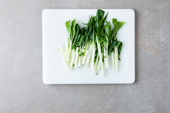 Inzwischen vom Pak Choi den unteren Strunk abschneiden und den Pak Choi in ca. 1-2cm breite Streifen schneiden.