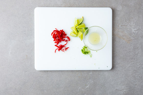 Die Chili in feine Streifen schneiden, je nach Schärfewunsch zuvor längs halbieren und entkernen. Ca. 2TL der Limettenschale abreiben, dann die Limette auspressen. Die zweite Limette in Spalten schneiden.