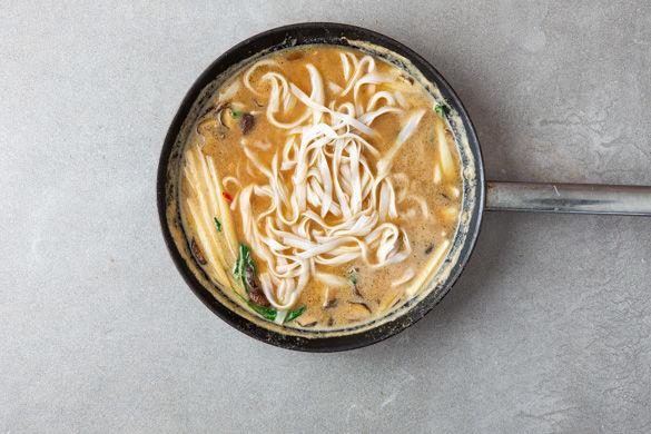 Die Pilze in dünne Scheiben schneiden. Eine hohe Pfanne oder einen großen Topf mit 1EL Öl auf mittlerer Stufe erhitzen und die Pilze darin ca. 2-3Min. goldbraun anbraten. Die Misopaste mit Erdnussbutter, Sojasauce und den Brühwürfeln mit 1 Prise schwarzem Pfeffer in einer kleinen Schüssel verrühren und mit 2L Wasser zu den Pilzen geben und aufkochen lassen.