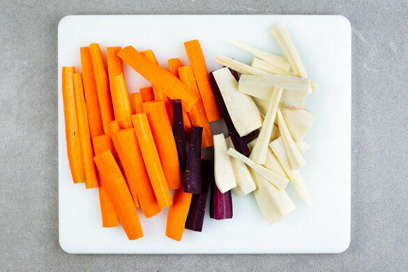 Den Backofen auf 240°C (220°C Umluft) vorheizen. Die Petersilienwurzeln schälen. Die Karotten und die lila Karotte ggf. schälen und das Gemüse längs vierteln. Große Stücke ggf. quer halbieren.