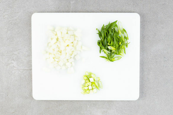 Den weißen Teil der Lauchzwiebel in grobe Ringe, den grünen Teil schräg in feine Ringe schneiden. Die Zwiebel schälen, halbieren und grob würfeln.