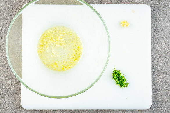 Den Knoblauch schälen und sehr fein würfeln oder durch eine Knoblauchpresse drücken. Die Limettenschale abreiben, dann die Limette halbieren und auspressen. Die 1/2 des Knoblauchs mit 1–2EL Limettensaft, 1EL Pflanzenöl und 1TL Honig zu einem Dressing verrühren. Mit Salz und Pfeffer abschmecken.
