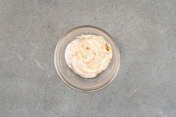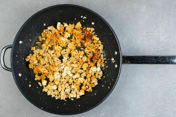 Den Tofu trocken tupfen, dabei möglichst viel Flüssigkeit auspressen, dann grob zerkrümeln und in einer großen Pfanne mit 2EL Pflanzenöl, 1TL Salz und 1 Prise Pfeffer bei starker Hitze ca. 5Min. goldbraun braten. Die 1/2 der Gewürzmischung und den restlichen Knoblauch untermengen und ca. 1Min. weiterbraten, bis der Tofu leicht knusprig ist.