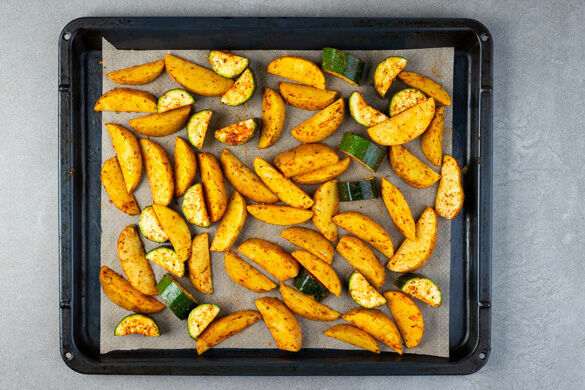 Den Backofen auf 220°C (200°C Umluft) vorheizen. Die Kartoffeln samt Schale der Länge nach halbieren und in dünne Spalten schneiden. Größere Kartoffeln vorher noch einmal quer durchschneiden. Die Zucchini längs halbieren und quer in ca. 2cm dicke Scheiben schneiden.