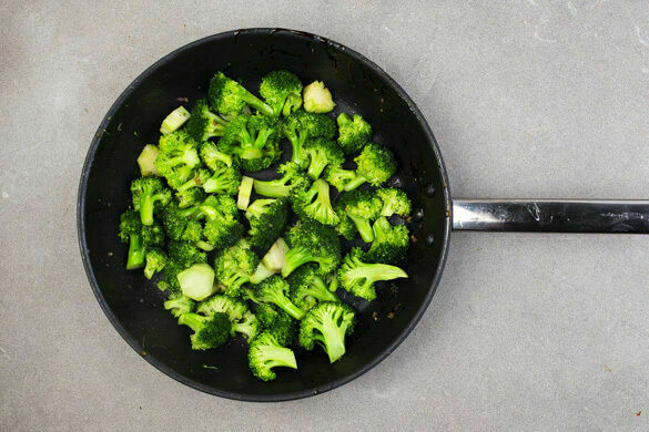 Den Brokkoli und den Knoblauch in der Pfanne bei mittlerer Hitze ca. 2Min. unter Rühren anbraten. Mit 2–3EL Wasser ablöschen und abgedeckt in 3–4Min. bissfest garen. Den Brokkoli mit Salz und Pfeffer abschmecken und mit den Röstkartoffeln zum Teriyaki-Lachs servieren.