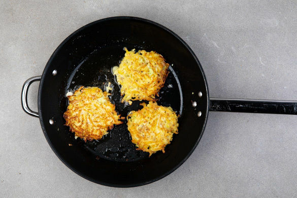 Das Gemüse in einem Küchentuch gut auswringen und mit 1 Ei, den restlichen Lauchzwiebeln und 2–3EL Mehl vermengen. Mit Salz und Pfeffer würzen. In einer großen Pfanne 2EL Olivenöl bei mittlerer Hitze erwärmen, dann mit einem Esslöffel 5–6 Reibekuchen formen und bei niedriger bis mittlerer Hitze auf jeder Seite 4–5Min. braten, bis die Reibekuchen goldbraun und gar sind.
