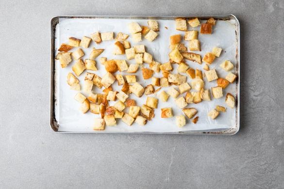 Das Brötchen in ca. 1cm große Würfel schneiden und auf einem zweiten, mit Backpapier ausgelegten Blech verteilen. Mit 1-2EL Olivenöl und Salz mischen und ca. 5-6Min. im Ofen goldbraun rösten.