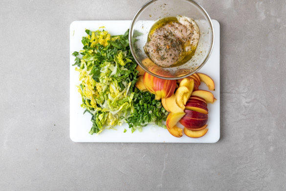 Den Backofen auf 180°C Umluft oder 200°C Ober-/Unterhitze vorheizen. Das Hähnchen mit 1-2EL Olivenöl und der Gewürzmischung einreiben und kurz ziehen lassen. Den Salat bis auf den Strunk in feine Streifen schneiden. Die Lauchzwiebel in feine Ringe schneiden. Die Nektarinen halbieren, den Stein entfernen und in feine Streifen schneiden.