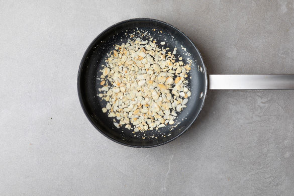 Die Mandeln bei mittlerer Hitze ohne Öl in einer mittelgroßen, ofenfesten Pfanne ca. 2-3Min. goldbraun rösten. Vorsicht, die Mandeln können schnell anbrennen! Zum Abkühlen aus der Pfanne nehmen, sie dunkeln sonst noch nach. Die Pfanne beiseitestellen.