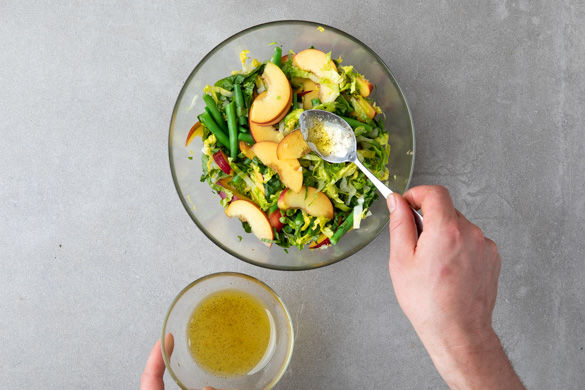 Die Nektarine ist eine enge Verwandte des Pfirsichs und versüßt dir mit ihrer saftigen Konsistenz und ihrem süß-fruchtigen Geschmack die Stunden, denn Nektarinen sind fast fettfrei und kalorienarm. Aber auch für herzhafte Gerichte hat die Frucht einiges drauf! Probier es aus und serviere sie mit diesem saftigen Hähnchensalat mit grünen Bohnen und Mandeln!