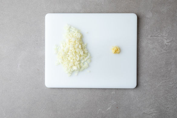 Währenddessen die Zwiebel schälen, halbieren und in feine Würfel schneiden. Die Knoblauchzehe schälen und ebenfalls in feine Würfel schneiden.