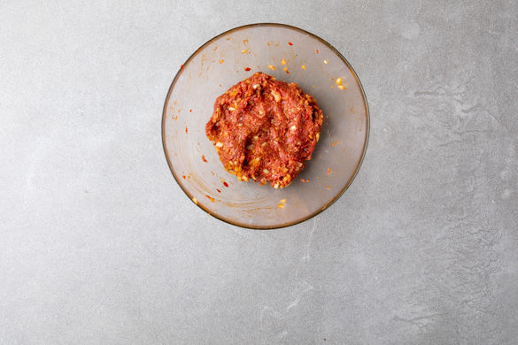 Das Hackfleisch mit den Zwiebeln, dem Knoblauch, je nach Schärfewunsch mit Sambal Oelek und dem Berbere-Gewürz gründlich vermengen, evtl. mit Salz nachwürzen.