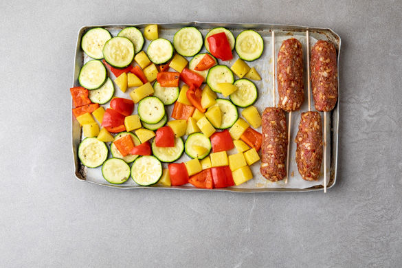 Das Fleisch in 8 gleich große, längliche Rollen formen, auf die Spieße ziehen und leicht andrücken. Die Spieße nach Ablauf der Backzeit mit auf das Gemüseblech geben und alles ca. 15-20Min. im Ofen garen, bis das Fleisch und das Gemüse gar sind. Nach der Hälfte der Zeit die Spieße und das Gemüse einmal wenden.
