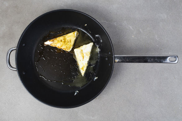 In einer großen Pfanne ca. 3–4EL Olivenöl stark erhitzen und den Käse darin auf jeder Seite ca. 1–2Min. knusprig anbraten.