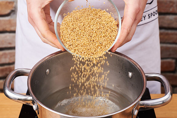 Sobald das Wasser kocht, den Bulgur hineingeben und in ca. 15Min. bissfest kochen. In ein Sieb abgießen und ausdampfen lassen.