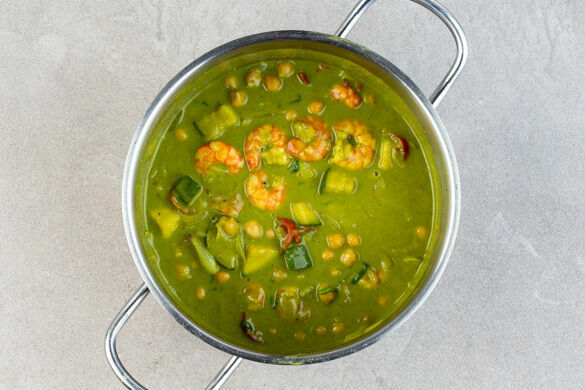 Es geht schnell, es sieht toll aus und es schmeckt noch besser. Unsere Argumentation für dieses farbenfrohe Curry ist vielleicht nicht besonders originell, dafür dürfte sie umso überzeugender sein. Wenn sich Garnelen mit nussigen Kichererbsen in einer sämigen Kokosmilch-Spinat-Matrix treffen, dann schreien die Geschmacksknospen schon vorher innerlich Hurra. Unsere Empfehlung: Kurz den Anblick genießen – und dann rein damit!
