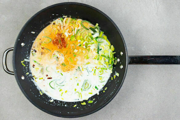In einem mittelgroßen Topf 800ml leicht gesalzenes Wasser zum Kochen bringen. Den Lauch längs halbieren und in dünne Streifen schneiden. Den Knoblauch und den Ingwer schälen und fein reiben oder sehr fein würfeln.